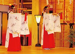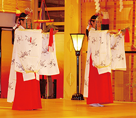 かぐら「みつるぎ」は、熱田神宮桐竹会(雅楽奉仕団体)より同会創立五十周年を記念して、平成六年に奉納されたものです。この神楽は岡本宮司(当時)の歌に、宮内庁楽部元首席楽長東儀文隆氏が曲を、同元楽長薗広晴氏が舞を付けられたものです。舞振りは、大和舞のもつ古風典雅な舞に、荘重さを加えた趣となっており、毎年春秋の熱田講社大祭において神前に奉奏されております。